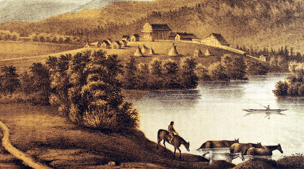 This drawing of the Cataldo Mission by Gustavus Sohon between 1858-1862 was made while traveling with Captain John Mullan. Courtesy of The Museum of North Idaho. The photo was part of a Spokesman-Review package by reporter Becky Kramer & photographer Kathy Plonka Thursday in which archaelogists questioned the location of a hazardous waste repository near the Old Mission. Story here.