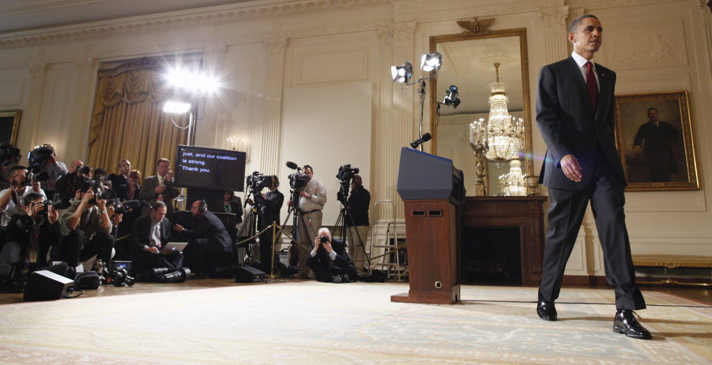 President Barack Obama leaves the podium after making a statement about Libya in the East Room of the White House in Washington today. Obama said the U.S. is ready to join international efforts in imposing a no-fly zone in Libya but won’t commit ground troops to the effort. Story here. (AP Photo)
