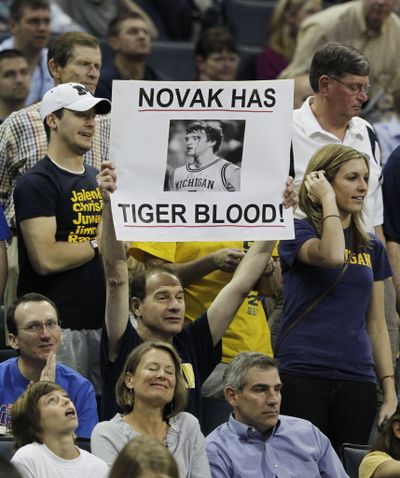 A Michigan fan cheers with others in the second half of a West Regional NCAA tournament second round college basketball game against Tennessee, Friday, in Charlotte, N.C. (AP Photo/Bob Leverone)
