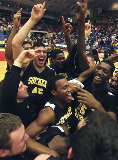 College of Southern Idaho celebrates after the Eagles won the NJCAA men’s basketball national championship game 72-64 over Midland College, Saturday, at the Sport Arena in Hutchinson, Kan. Stories here and here . (APhoto/The Hutchinson News, Travis Morisse)