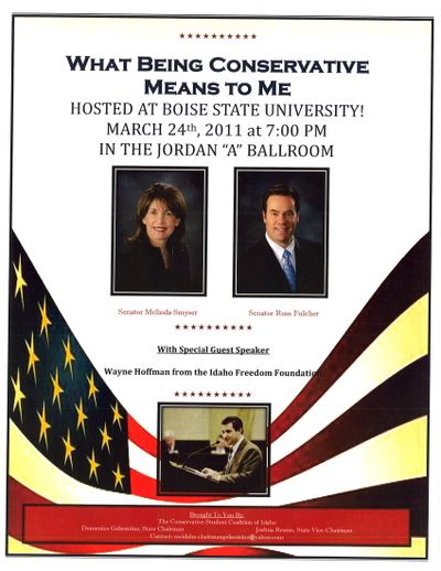 State Sens. Melinda Smyser and Russ Fulcher and Idaho Freedom Foundation founder Wayne Hoffman will speak at a Boise State University forum on Thursday re: “What Being Conservative Means to Me.”