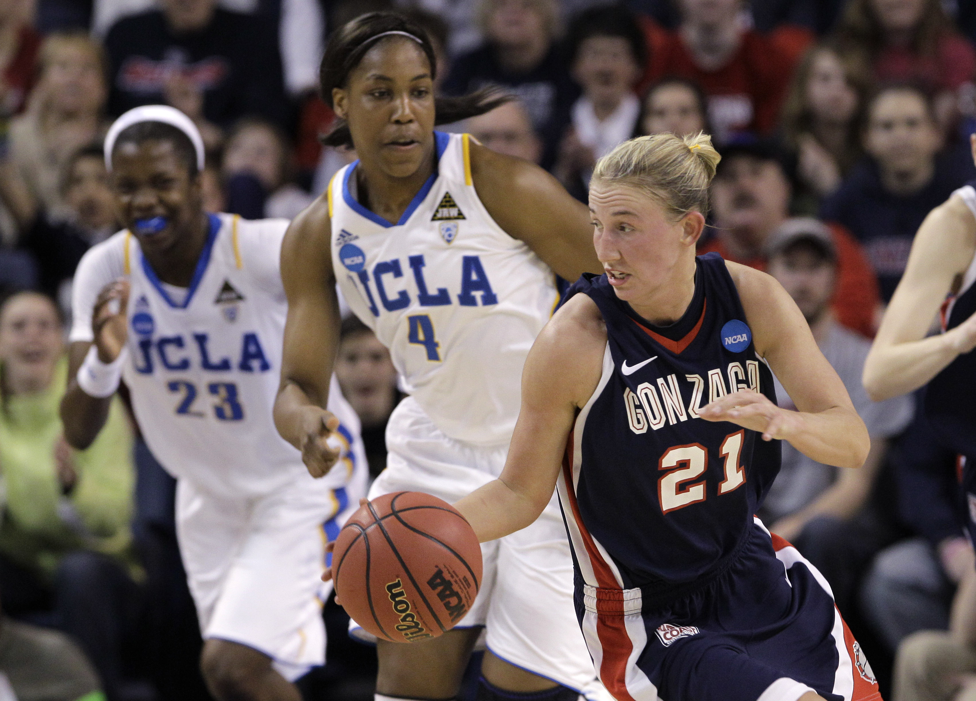 Gonzaga’s Courtney Vandersloot (21) is chased by UCLA’s Markel Walker (23) and Christina Nzekwe (4) as she races upcourt during the first half of their second-round game of the NCAA women’s college basketball tournament Monday in Spokane. Vandersloot scored 29 points and dished out 17 assists en route to becoming the first woman and man in Division I history to score more than 2000 points and hand out 1000 assists, in leading the Lady Zags to an upset 89-75 victory over UCLA. The win sends the Lady Zags to the Sweet 16 round for the second straight year. Associated Press story here . And: ESPN boxscore here. (AP Photo/Elaine Thompson)
