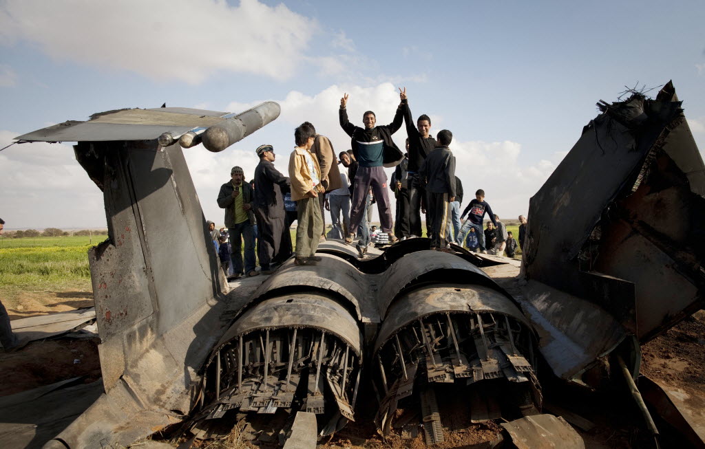 Libyans pose on the wreckage of a US F15 fighter jet after it crashed in an open field in the village of Bu Mariem, east of Benghazi, eastern Libya, earlier today, with both crew ejecting safely. The U.S. Africa Command said both crew members were safe after what was believed to be a mechanical failure of the Air Force F-15. The aircraft, based out of Royal Air Force Lakenheath, England, was flying out of Italy’s Aviano Air Base in support of Operation Odyssey Dawn.(AP Photo/Anja Niedringhaus)