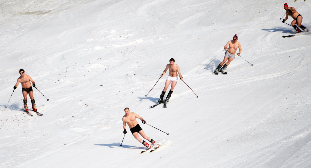 A group of Croatian fans ski down a slope wearing swimming suits at Mt. Sljeme near Zagreb, to celebrate the victory of Ivica Kostelic, Tuesday. Kostelic of Croatia has taken the World Cup slalom title and won the overall alpine skiing World Cup title. (AP Photo)