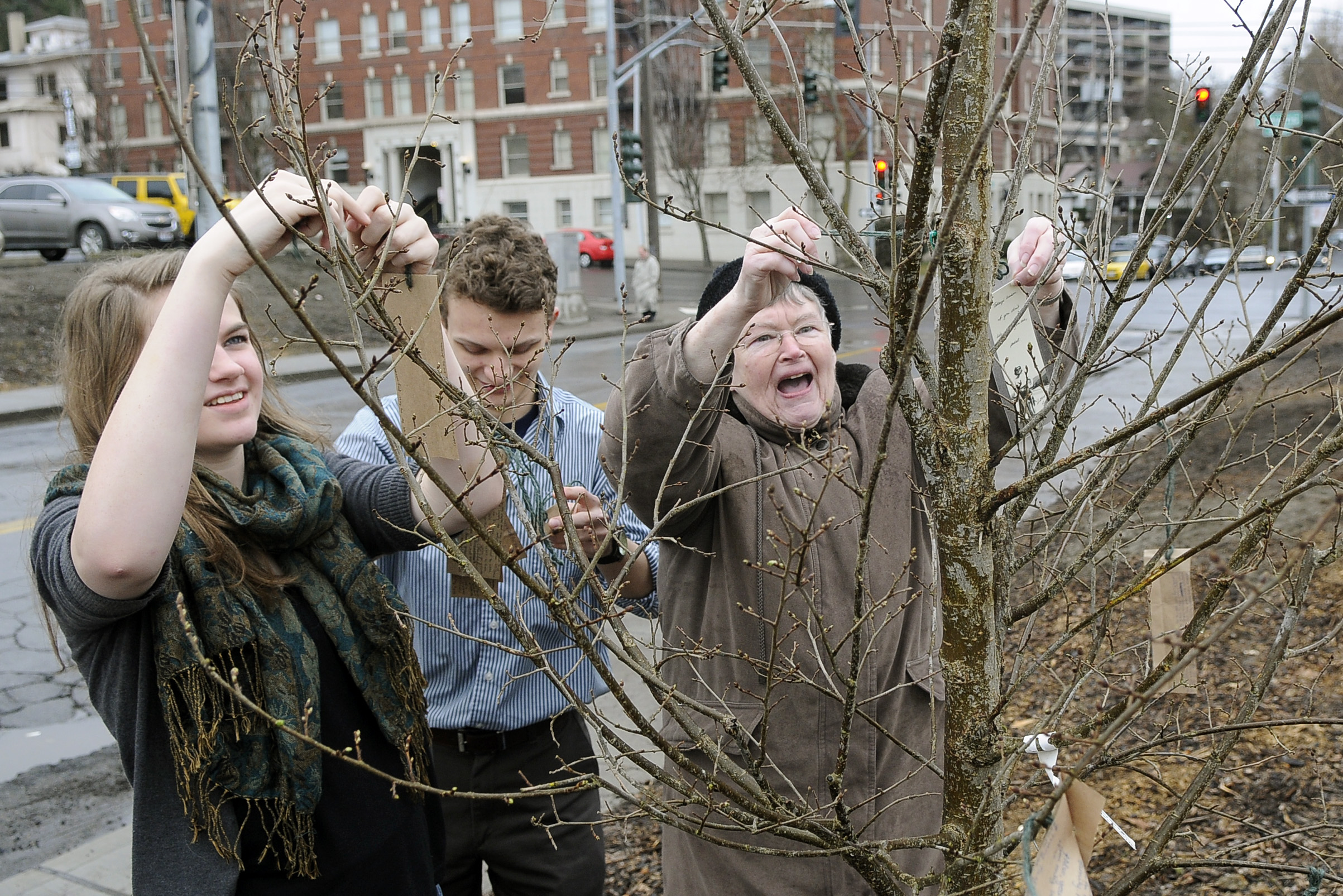 (About the S-R photographer Dan Pelle photo: Lewis and Clark High School drama students, Liz Connelly, 17, and Jon O’Grady hang messages on one of six trees along 6th Avenue between Washington and Stevens Streets, March 25, 2011 in Spokane, Wash. After hearing about the Spokane Public Schools’ replanting project, Nancy MacKerrow (right), of Spokane, whose daughter, Suzie Stephens, an LC grad who was killed while crossing a street and hit by a bus in 2002, helped gather students from the drama, advanced art ecology, special education, debate and Japanese Club to plant trees and adorn them with tree-grams.)