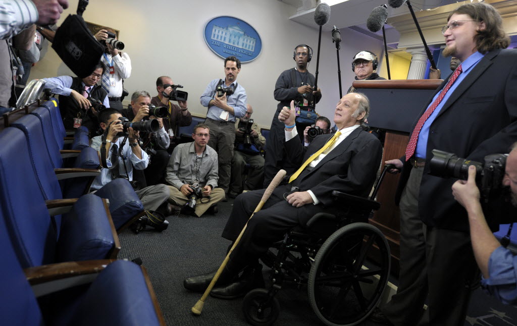 James Brady, the press secretary for President Ronald Reagan, and his son Scott, right, visit the James S. Brady Press Briefing Room on the 30th anniversary of the assassination attempt on President Ronald Reagan today. Huffington Post story here . (AP Photo/Susan Walsh)