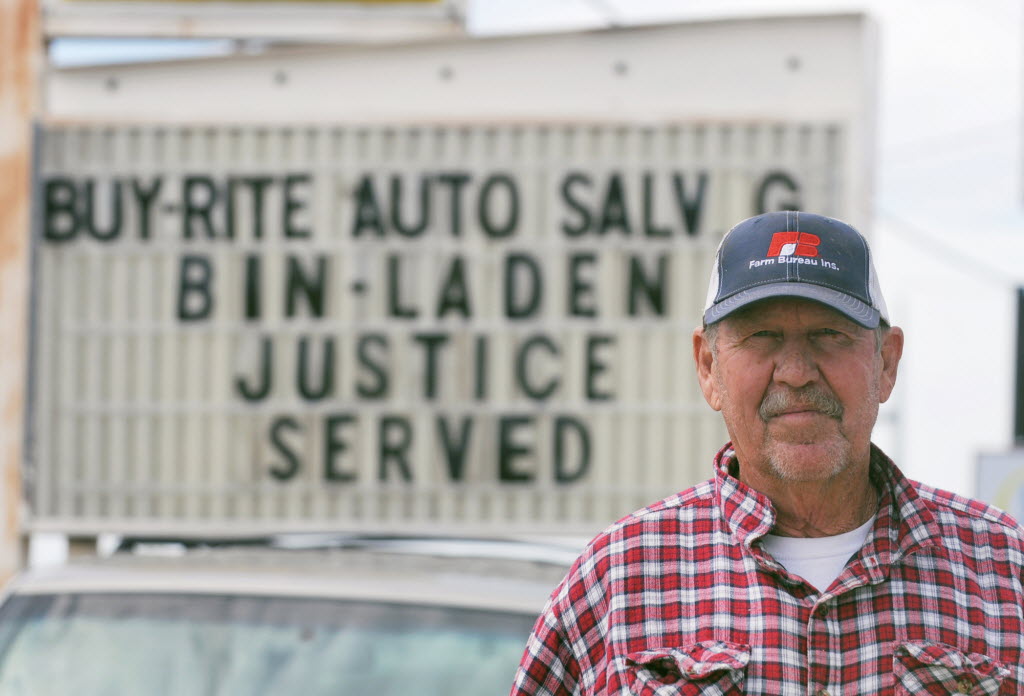 DeRoy Bassett, owner of Buy-Rite Auto Salvage, poses for a picture outside his business on Monday in Nampa. Not long after the terrorist attacks of Sept. 11 Bassett posted the message: “Bin Laden - You’re Next” on the marquee outside his business. The sign remained unchanged for ten years before being updating Monday with the message: “Bin Laden - Justice Served”. (AP Photo/Idaho Press-Tribune, Charlie Litchfield)