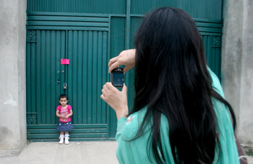 A Pakistani woman photographs her daughter at a gate of the compound where al-Qaida leader Osama bin Laden was caught and killed in Abbottabad, Pakistan Thursday. The residents of Abbottabad were still confused and suspicious about the killing of bin Laden, which took place in their midst before dawn on Monday. (AP Photo/Aqeel Ahmed)