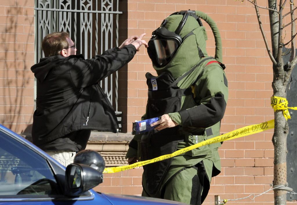 A member of the Spokane Explosive Disposal Unit holds paper packaging found in a device left at the front counter of the Spokesman-Review Tuesday in downtown Spokane, Wash. The package was moved to a shipment receiving bay when the officer inspected the device. Story here. (AP, SR photo: Dan Pelle)