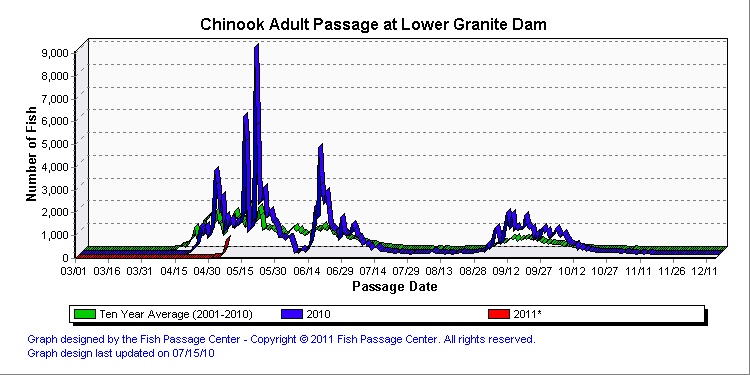 “These are awesome numbers, but when we really get excited is when we see those BIG numbers and impressive days at Lower Granite,” she said. As of Sunday, 1,571 spring chinook had crossed Lower Granite, the last Snake River Dam before the fish enter Idaho near Lewiston.