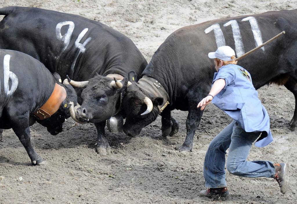 Three cows fight during the traditional annual “Combats de Reines” (Battle of the Queens), a cow fight in Aproz, western Alpine canton of Valais, Switzerland Sunday. The Valais is home to a unique breed of cows, the Herens also called Eringer cows. Members of this bovine family are very robust and possess the singular characteristic of fighting among themselves to establish a hierarchy within the herd. You write the cutline. (AP Photo/Keystone, Jean-Christophe Bott)
