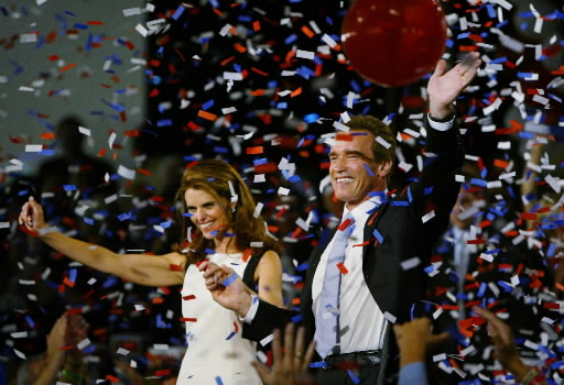 In this 2003 AP file photo, Republican Arnold Schwarzegger, right, is joined by his wife, Maria Shriver, as he celebrates his victory in the California gubernatorial recall election in Los Angeles, Oct. 7, 2003. Times have change. Now Schwarzenegger and Shriver are splitting after 25 years of marriage. Story here. (AP file photo/Chris Carlson)