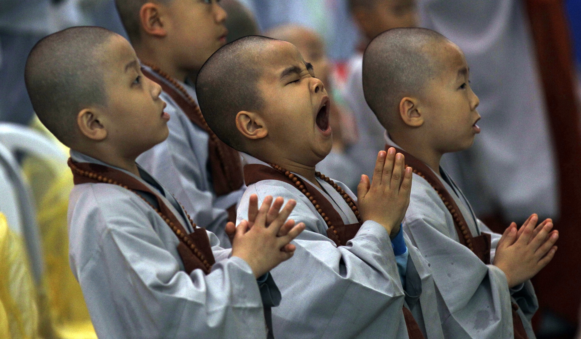 A shaven-headed young boy yawns as others put their hands together during a service to celebrate the birthday of Buddha at Jogye temple in Seoul, South Korea, Tuesday. A group of children entered the temple, the main temple of Korean Buddhism’s Chogye Order, to experience a monk’s life for a month to celebrate Buddha’s birthday on May 10. You write the cutline. (AP Photo/ Lee Jin-man)