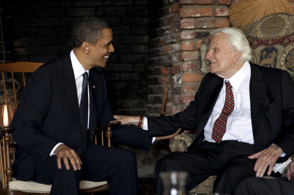 President Barack Obama meets with Billy Graham at his mountainside home in Montreat, N.C., on April 25, 2010. Obama concluded his North Carolina vacation with his first meeting of the ailing evangelist, who has counseled commanders in chief since Dwight Eisenhower. Graham was admitted to an Asheville, N.C. hospital earlier today for treatment for pneumonia. Doctors say the 92-year-old Graham came to Mission Hospital Wednesday morning after suffering a health episode overnight. Initial testing suggest pneumonia, and diagnostic studies show his heart is normal. Graham spokesman Larry Ross says the evangelist is feeling better since he arrived at the hospital. (AP Photo/The White House, Pete Souza)