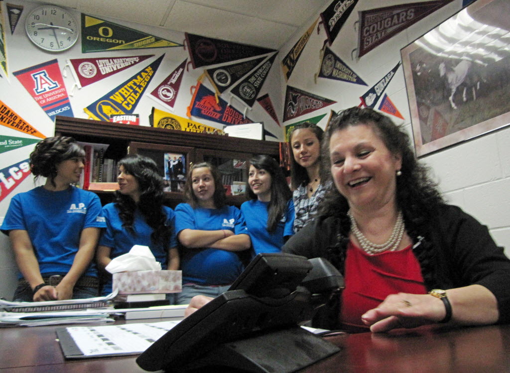 Tamra Jacksond, right, principal of Bridgeport High School in Bridgeport, Wash., and five students eagerly await a call from the White House earlier. The school was one of three finalists vying for a commencement speech by President Barack Obama, but a school in Tennessee won the honor. Jody Lawrence-Turner SR story here. (AP Photo/Shannon Dininny)