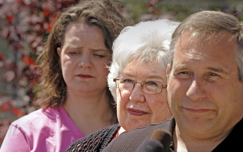 Alan Creach, right, stands with his mother Imogene, center, and other family members near the spot where their father was killed by a Spokane County Sheriff Deputy at The Plant Farm in the Spokane Valley. The Creach family held a press conference Wednesday to respond to the Sheriff Departments annoucement that the shooting death was both reasonable and justified. They have installed bright yellow chain to keep vehicles out of the parking lot when the business is closed. Thomas Clouse SR story here. (SR photo: Christopher Anderson)