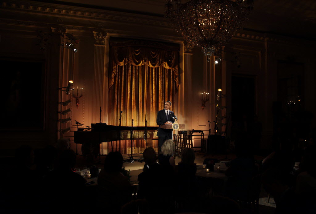 President Barack Obama speaks as he and first lady Michelle Obama, not seen, host a celebration of American poetry and prose at the White House earlier today in Washington (AP Photo/Carolyn Kaster)