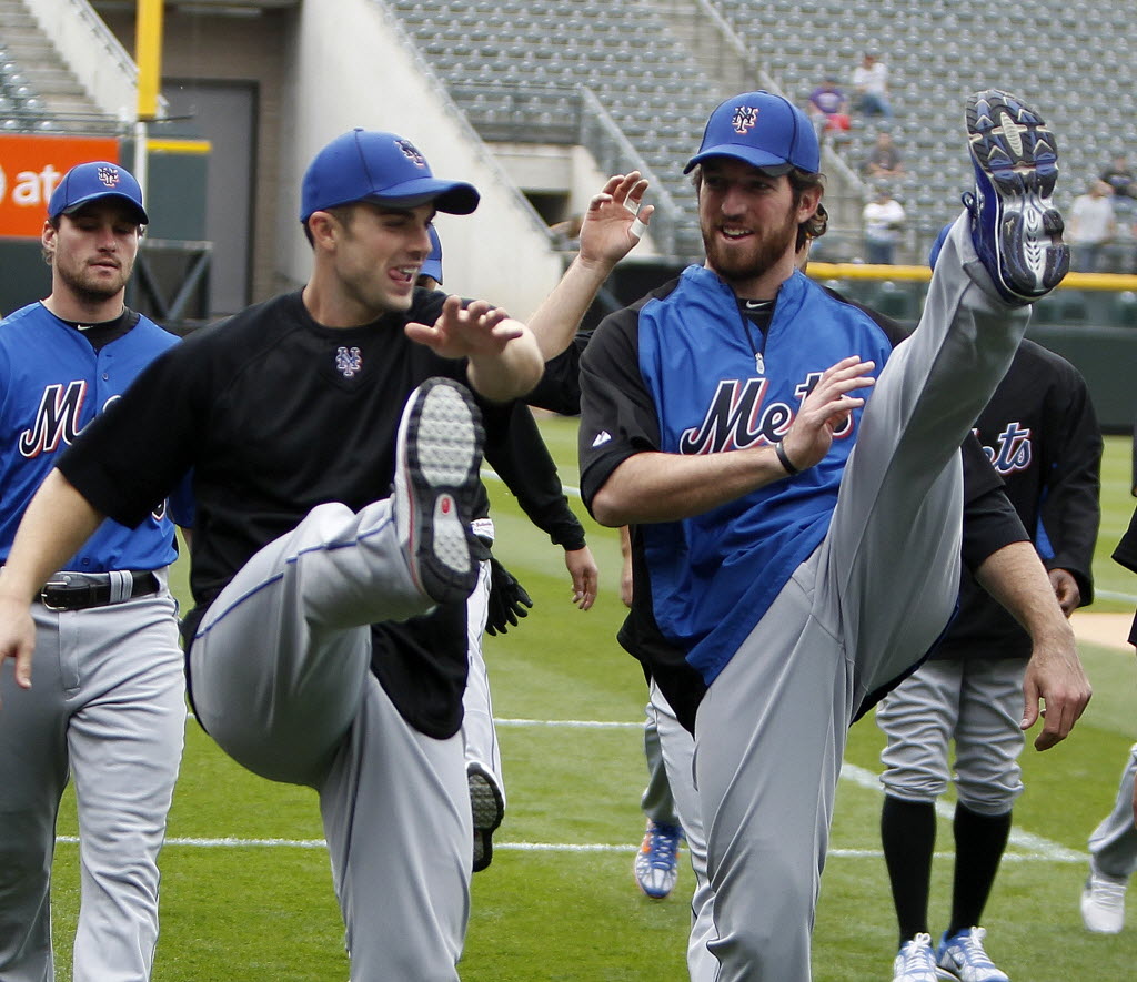 New York Mets third baseman David Wright, left, and first baseman Ike Davis high kick as they stretch before a baseball game against the Colorado Rockies at Coors Field in Denver on Tuesday. You write the cutline. (AP Photo/Ed Andrieski)