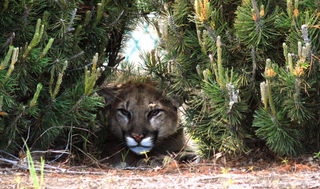 A cougar rests in the shade of bushes near the Safeway Food store in Lewiston Wednesday. Idaho Fish & Game officers successfully tranquilized and captured the big cat that found its way into town. Eric Barker’s Lewiston Tribune story here. (AP Photo/Lewiston Tribune, Barry Kough)