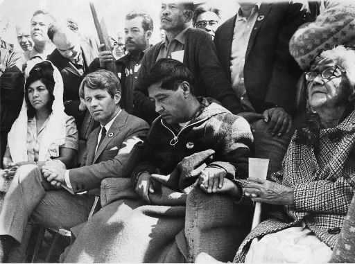 In this March 11, 1968, AP file photo, Cesar Chavez (with U.S. Sen. Robert F. Kennedy) eats a piece of bread to end his 25-day fast at Delano, Calif. About 4,000 farm workers joined him in a symbolic bread-breaking ceremony marking the end of their leader’s fasting for the principle of non-violence. Now, a California Republican congressman is objecting to Navy plans to name a cargo shape after the famed farm labor leader. Story here. (AP Photo/Fresno Bee, Richard Darby)