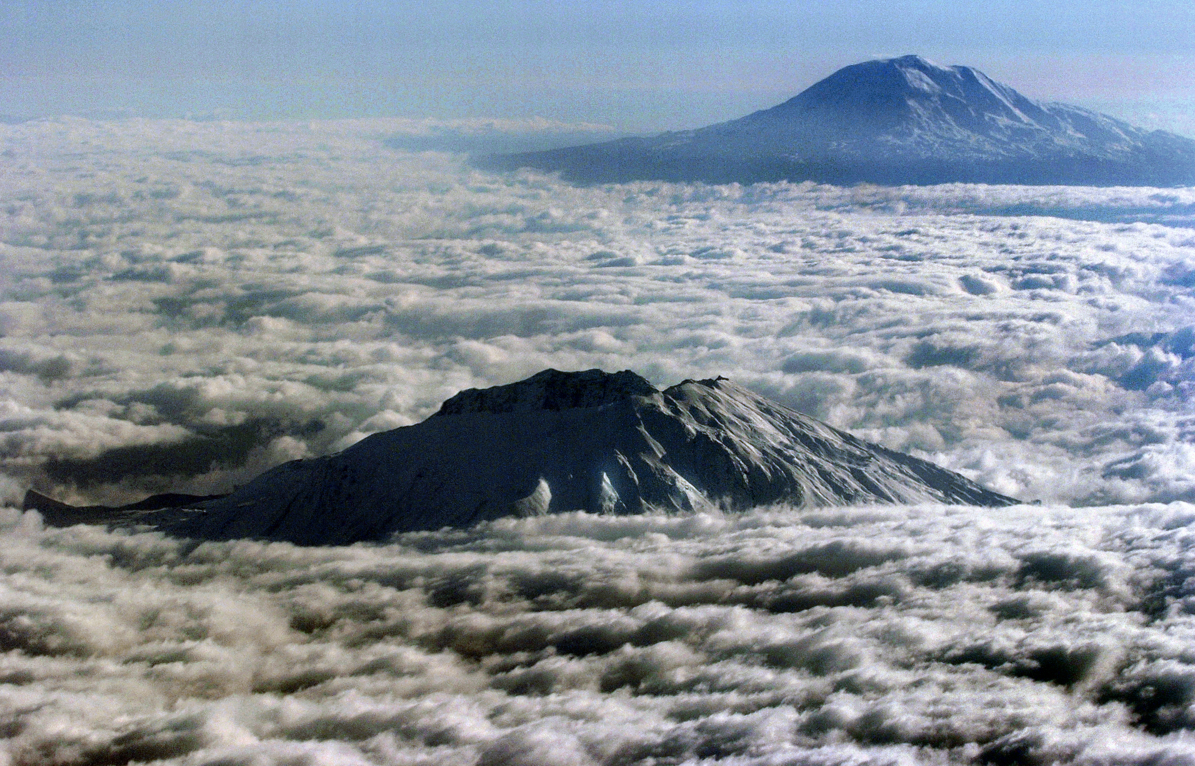 The jagged snow-covered crater has been mostly quiet since the most-recent dome building eruption ended in 2008, leaving a mound in the crater.