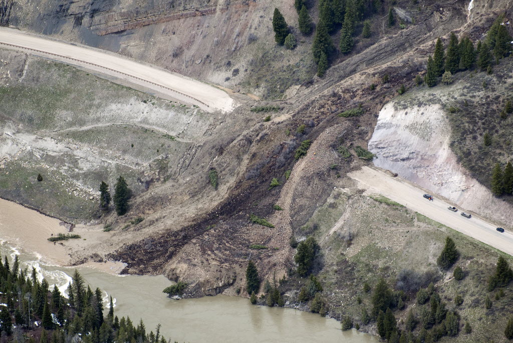 A massive landslide covers about 300 feet of Highway 89 in Snake River Canyon, near Jackson, Wyo., in this aerial photo taken Tuesday. The slide, which was about 40 feet deep on the road and almost 2,000 feet long at the time this photo was taken, indefinitely closed Highway 89 between Jackson and Alpine, Wyo. (AP Photo / Jackson Hole News&Guide, Bradly J. Boner)