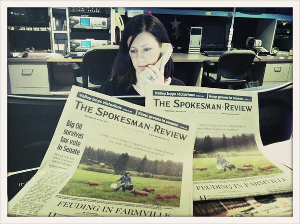 “Remember that runaway steer? ,” asks Nicole Hensley/Blush Response. “It came from Cable Creek Farm , owned by Beth Tysdal and her husband. They were recently featured on the front page of the Spokesman Review . Beth is also our assignment editor in the newsroom. Unfortunately, she’s leaving us soon to pursue her farming aspirations. Those dreams, however, are tinged with drama.” Nicole goes on to post that SR story re: Beth & her hubby, who are blocked by Kootenai County from operating their 80-acre farm near State Line the way they want to do so. You can read about that here.