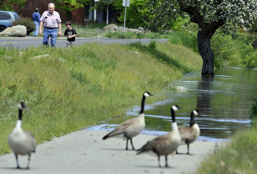 Bill Fishburn, 60, and his grandson Gavin Peterson, 4, made a trip from the South Hill to Upriver Drive and Stone Street, where water from the Spokane River flooded the Centennial Trail on Wednesday. Mike Prager SR story here. (SR photo: Dan Pelle)