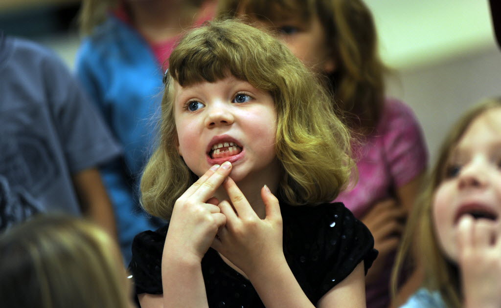 Garwood Elementary kindergartner, Jamie Crooks, shows the empty space for two of her bottom teeth during a presentation from Delta Dental at the school in Rathdrum on Thursday. As part of its community outreach work, Delta Dental of Idaho established the Captain Supertooth program to help educate young children about proper brushing and good dental health. (SR photo: Kathy Plonka)