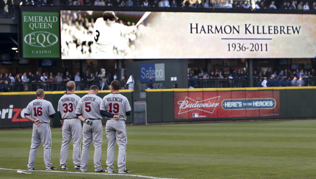 Minnesota Twins players stand along the third base line during a moment of silence to honor Hall of Famer Harmon Killebrew before the Twins’ baseball game against the Seattle Mariners on Tuesday in Seattle. Killebrew, the big-swinging slugger for the Twins and an A’s broadcaster from 1979-82, died Tuesday at 74 after battling esophageal cancer. (AP Photo/Elaine Thompson)