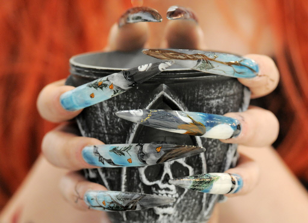A model shows her nails during the fourth German Nailart Trophy “Gothic — the dark side of nailart” at the Beauty Forum trade fair in Leipzig, eastern Germany, on Saturday. Beauty Forum 2011 is the most important cosmetic trade fair in Germany. (AP Photo/Jens Meyer)