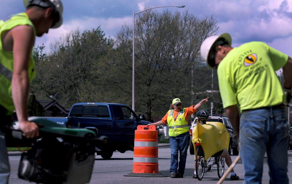 Elizabeth VanKeuren of Cat’s Eye Excavating, center, directs traffic as the city streets overlay project beagan on Ironwood Drive in Coeur d’Alene on Monday. (SR photo: Kathy Plonka)