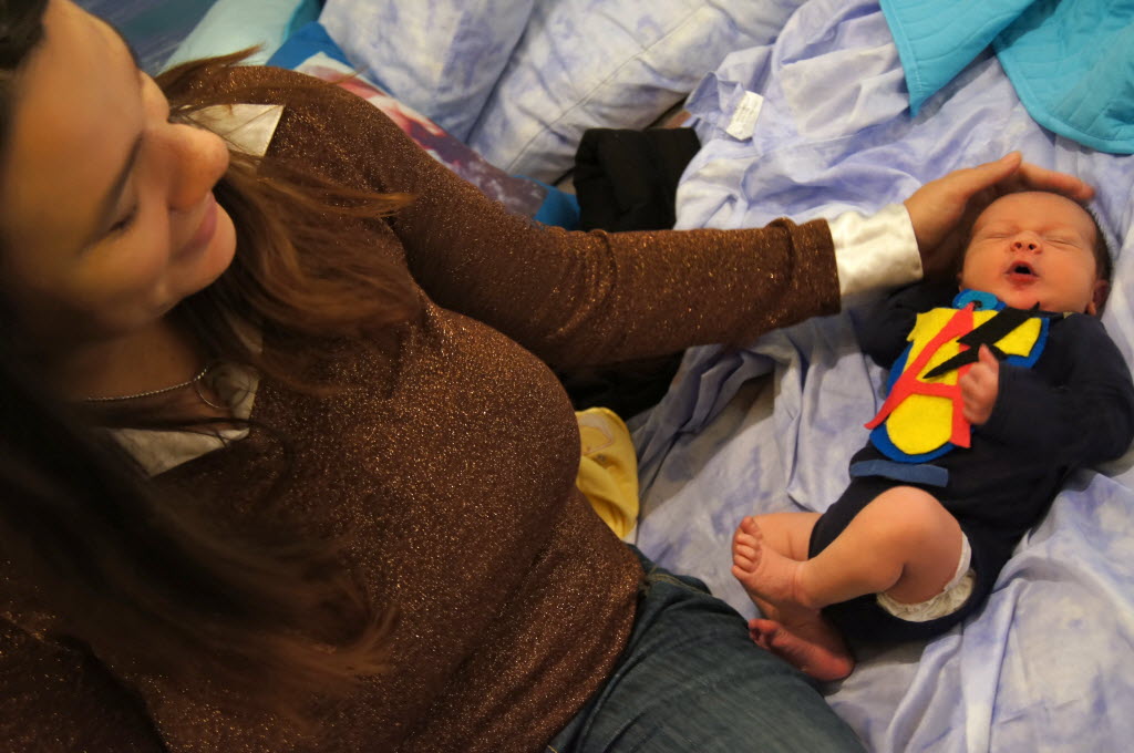 Marni Kotak holds her baby Ajax today at the gallery in Brooklyn, New York, where she gave birth to him a week earlier. The 36-year-old performance artist said it wasn’t weird to deliver the healthy 9-pound, 2-ounce baby boy during the performance of her life in front of the respectful and quiet gallery visitors. (AP Photo/Microscope Gallery, Andrea Monti)
