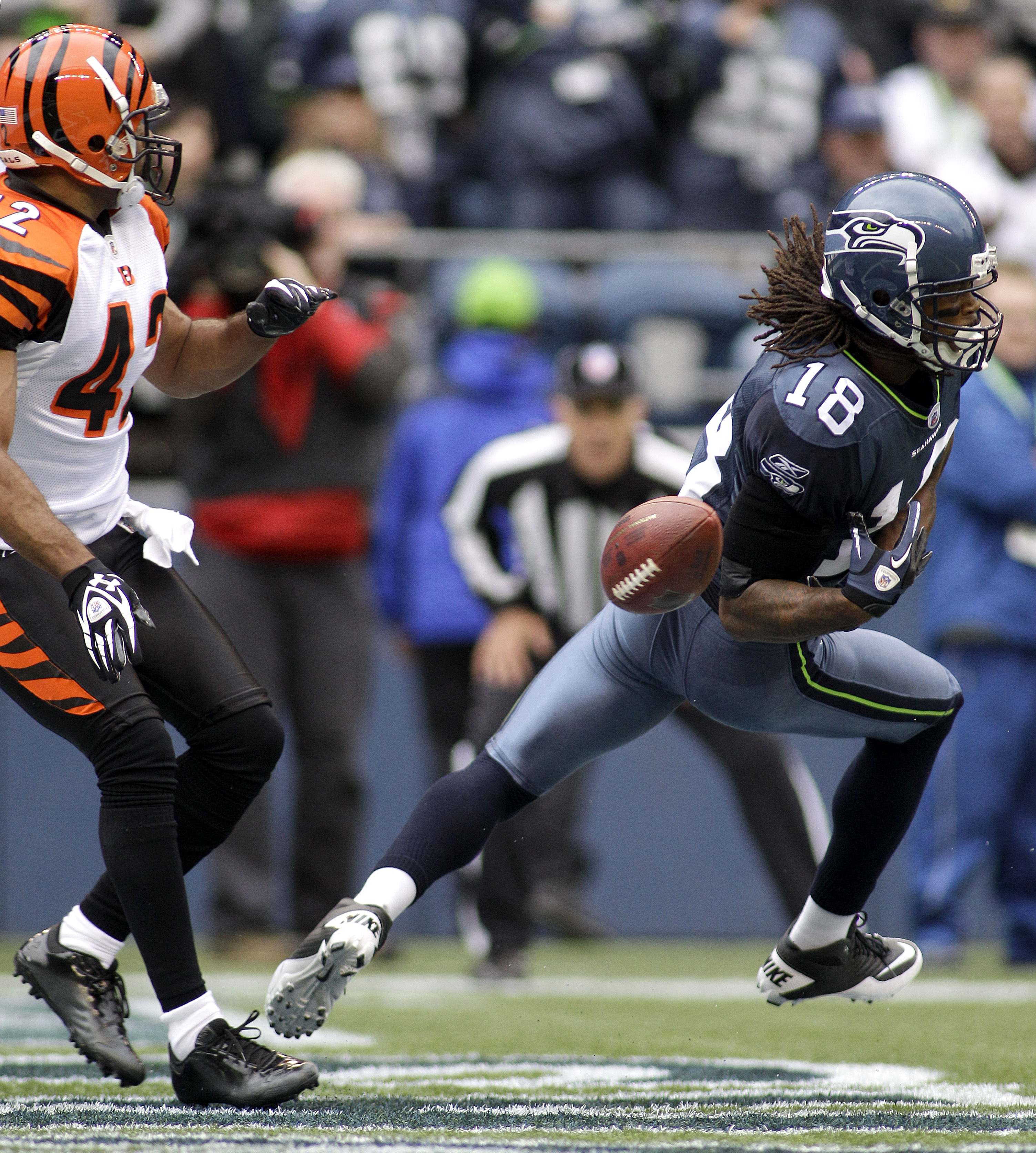 Cincinnati’s two second-half touchdowns both came late in the fourth quarter – one on a punt return by Brandon Tate and the other on an interception return by Reggie Nelson. Seattle’s defense gave up just 84 yards in the second half that gave the Seahawks a chance to rally from a 17-3 halftime deficit.