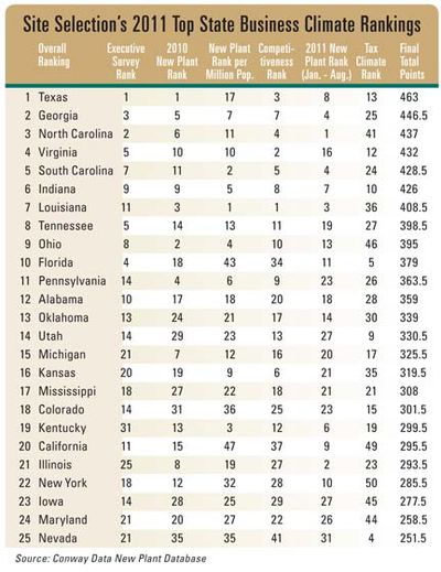 SiteSelection magazine just published its 2011 list of most business friendly states, based on both objective data and subjective issues such as general sense of cooperation and state support for business.