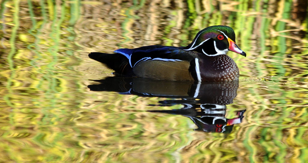 A male wood duck, with its multicolored, iridescent plumage and red eyes, paddles through the marshy waters of the Cannon Hill Park pond on Tuesday in Spokane. The water reflects the foliage around the edge of the pond. (SR photo: Dan Pelle)