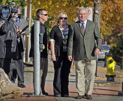 Spokane police officer Karl Thompson, right, waits to cross the street after leaving the William O. Douglas Federal Courthouse in Yakima, Wash. Wednesday. A federal court jury on Wednesday convicted Thompson of using excessive force on a mentally ill man who died in 2006 after being struck and Tasered at a convenience store. Story here. (AP Photo/The Spokesman-Review, Christopher Anderson)