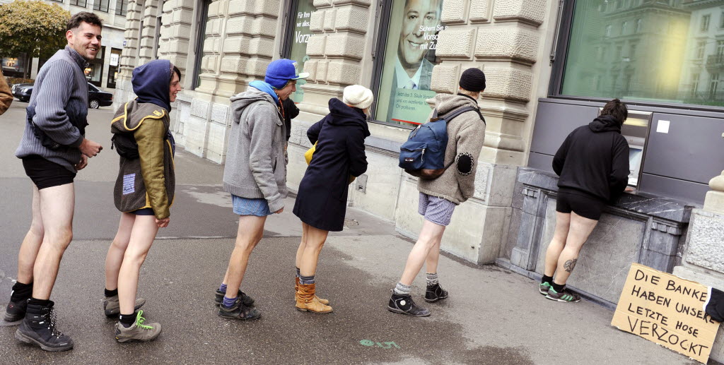 Activists of the Occupy muvement stage a protest without trousers in front of a cash dispenser at the headquarters of the Swiss bank Credit Suisse at the Paradeplatz square in Zurich, Switzerland, Thursday. Message on the banner reads: “The banks have gambled away our last trousers.” You write the cutline. (AP Photo/Keystone, Walter Bieri)