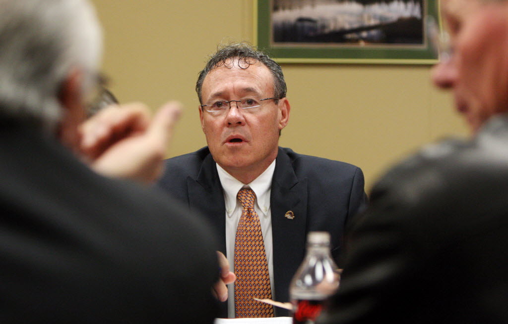 Boise State University interim athletic director Curt Apsey speaks with Idaho State Board of Education member Milford Terrell, left, and board president Richard Westerberg, left, during a board meeting in Boise on Thursday. The board voted to give Boise State University president Dr. Bob Kustra the authority to explore changing the school’s conference affiliation to the Big East Conference. Story here. (AP Photo/Idaho Statesman, Joe Jaszewski)