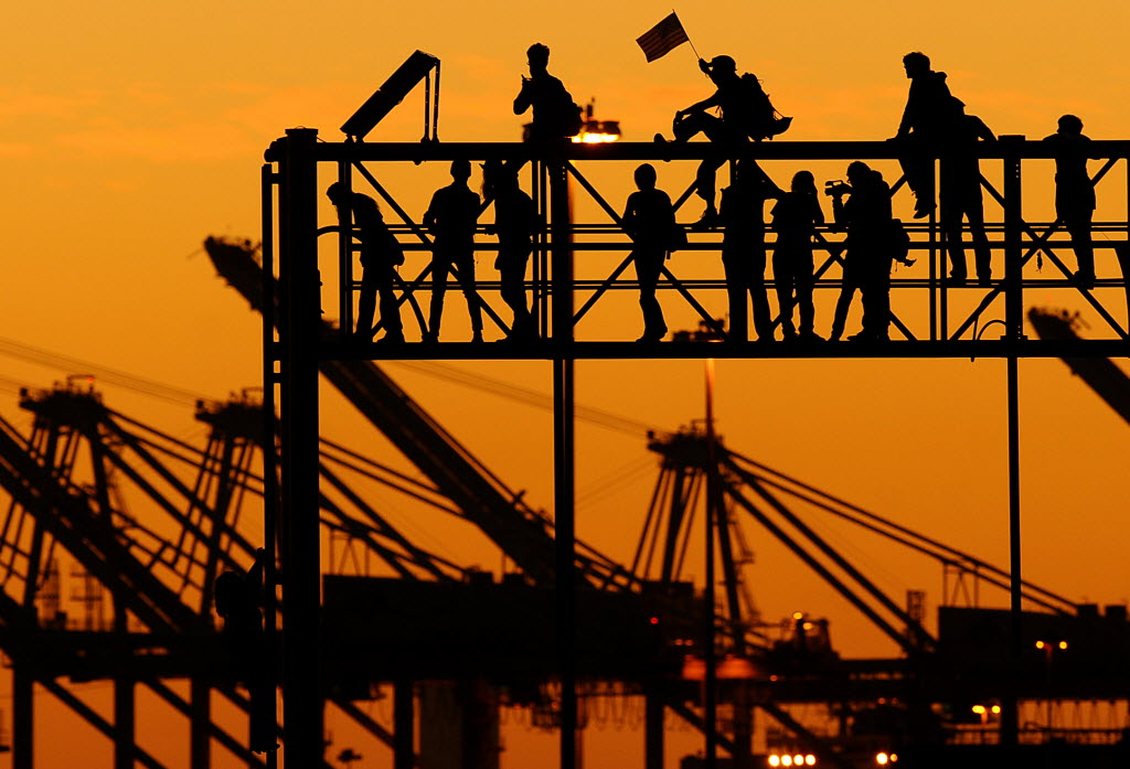 Occupy Oakland protesters stand atop a railroad scaffold at the Port of Oakland this week in Oakland, Calif. Thousands of Wall Street protesters took to Oakland’s streets as part of a day-long series of events, called a citywide strike, aimed at asserting the movement’s strength and shutting down commerce. (AP Photo/Noah Berger)