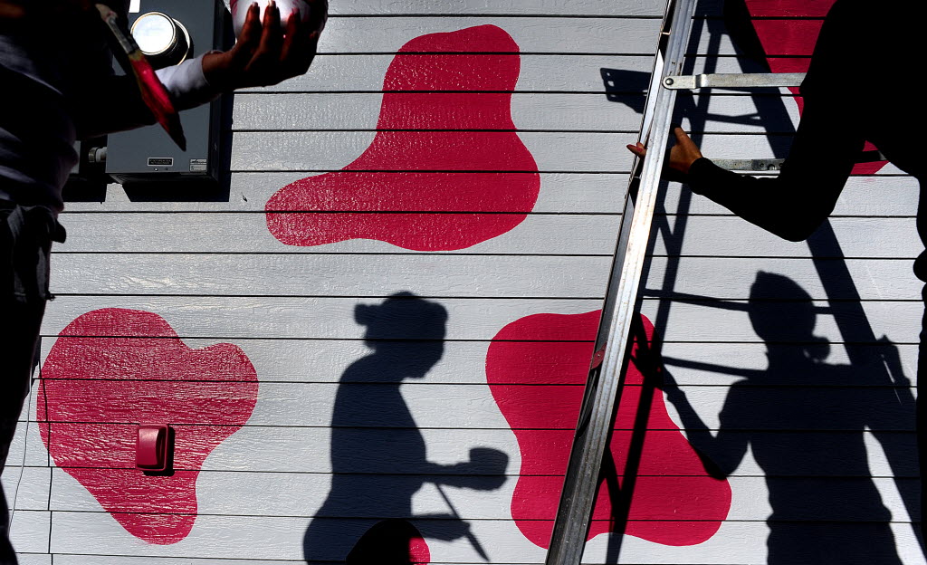 “She loves cows,” said Staci Bowden, left, about her friend Lea Hoiland, right, as the two painted Hoiland’s new business, Pink Spot Espresso, in Coeur d’Alene on Government Way near Haycraft Avenue on Wednesday. The shop is set to open Nov. 30. (SR photo: Kathy Plonka)
