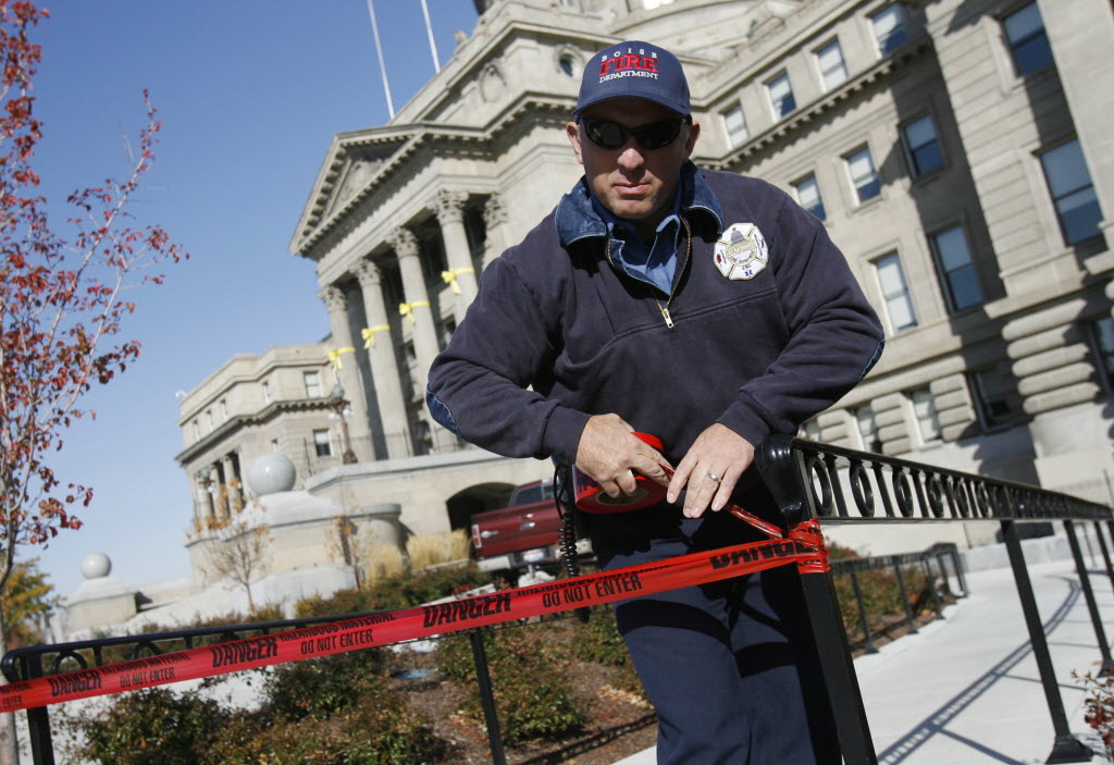 Boise Fire Department Capt. Mike Walker creates a perimeter around the Idaho Capitol Wednesday. The Capitol was evacuated after a suspicious letter or package was found containing white powder. A spokesman for Gov. C.L. “Butch” Otter confirmed Wednesday the state Capitol was cleared at about 11 a.m. while authorities investigated. Otter spokesman Jon Hanian says the governor was in the building at the time and evacuated along with other state employees. The substance was later determined to be benign. Story here. (Statesman photo: Joe Jaszewski)