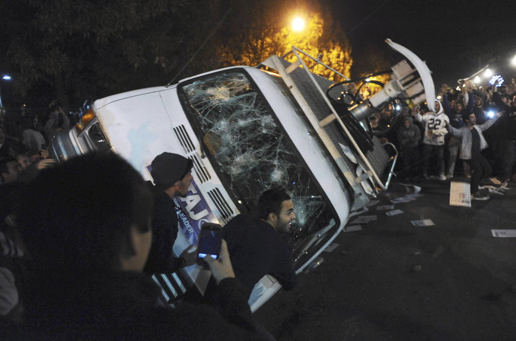 Penn State students flip a television news van during a riot after it was announced that Joe Paterno would no longer be head coach of Penn State football on Wednesday. Story of Paterno firing here . (AP Photo/Michael Henninger - Post-Gazette)