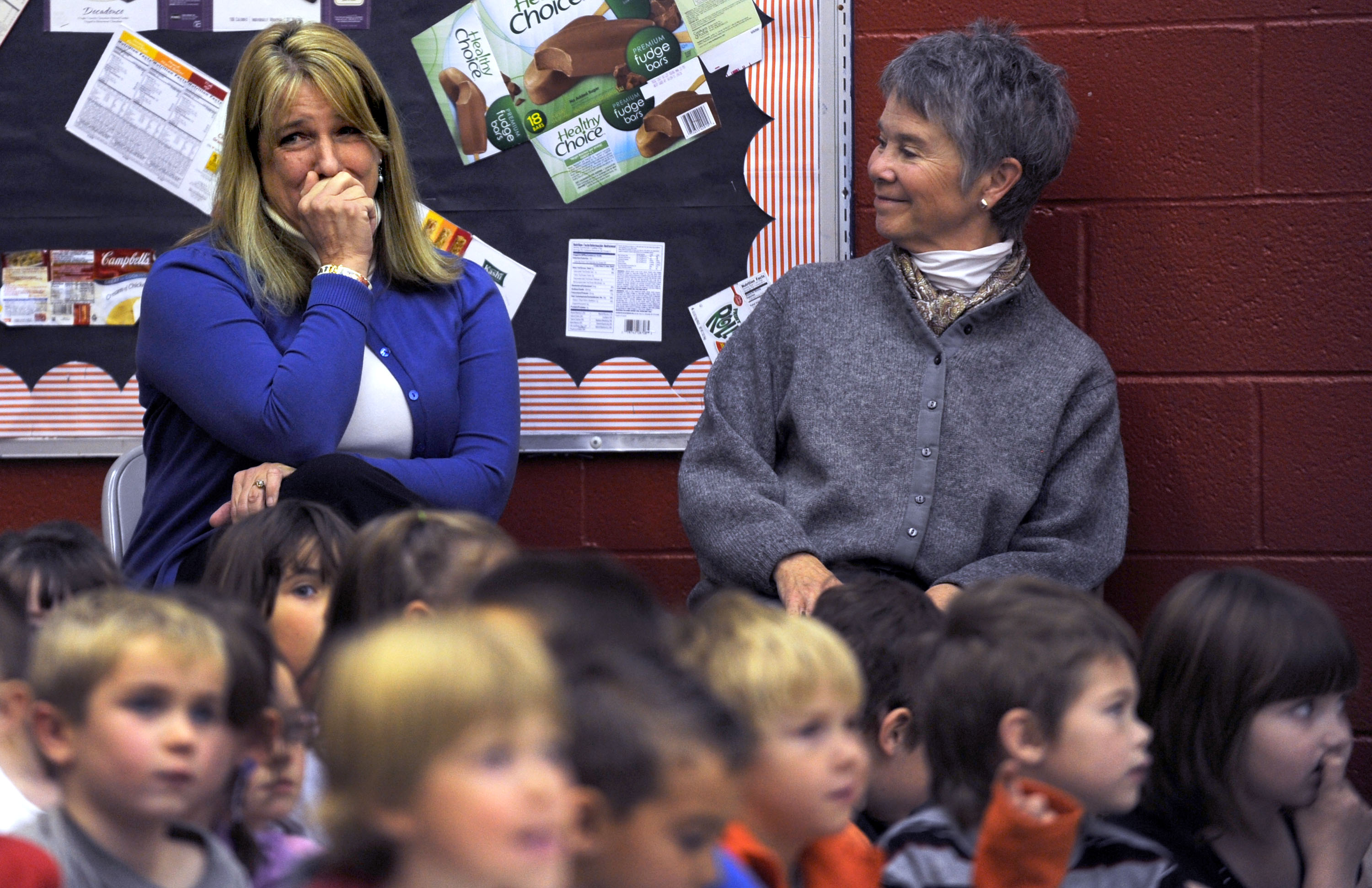 Winton Elementary School 1st grade teacher Erin Lenz, left reacts as she is announced as the 2012 Idaho Teacher of the Year while fellow 1stgrade teacher Ann Porter-Brown looks on. The announcement was given by Superintendent of Public Instruction Tom Luna at the School in Coeur d’Alene today. Among the other Coeur d’Alene School District teachers who have been named Idaho’s teacher of the year recently are: Mike Clabby Lake City High School 2007, Paula Conley Canfield Middle School 2005, Patti Perry Skyway Elementary School 2003, Nancy Larsen Ramsey Elementary School 2000 and Judy Bieze Hayden Meadows Elementary School 1999. (SR photo: Kathy Plonka)