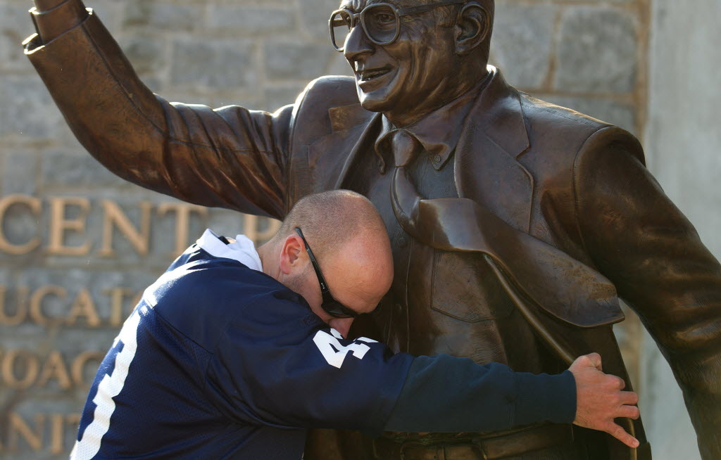 Penn State fan Gary Buck of West Grove, Pa., hugs a statue of former Penn State head coach Joe Paterno at Beaver Stadium before the football game between University of Nebraska and Penn State on Saturday in State College, Pa. Penn State is playing for the first time in decades without former head coach Joe Paterno, after he was fired in the wake of a child sex abuse scandal involving a former assistant coach. (AP photo, The Omaha World-Herald, Rebecca S. Gratz)