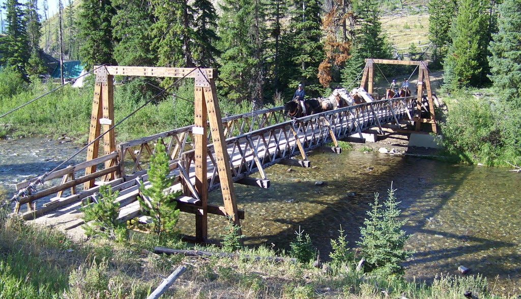 A pack of mules string crosses the newly completed 128-foot-long Gates Park Pack Bridge spanning the North Fork of the Sun River in the Bob Marshall Wilderness in northwestern Montana. Old-fashioned mule power and new construction techniques and tools were used to reconstruct the bridge. (AP Photo/Courtesy of U.S. Forest Service via Great Falls Tribune)