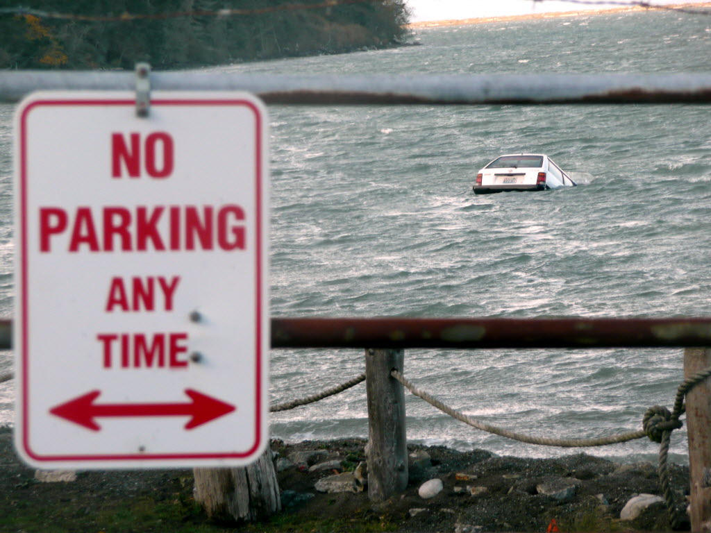 A car stuck in the mud at low tide Sunday night floats in Dungeness Bay near Cline Spit, Wash., on Monday. The owner of the 1994 Subaru station wagon, Chris Conrardy, who is in his 20s, told deputies that the car became mired after he drove it onto the beach at low tide Sunday night. He abandoned it, thinking he would tow it out Monday, said Detective Sgt. Lyman Moores. (AP Photo/Celene Wendt)