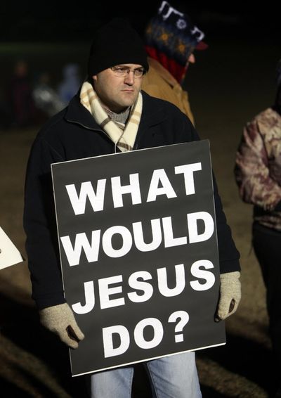 Ian Thomson, of Boise, Idaho, protests against the execution of Paul Ezra Rhoades at Idaho’s Maximum Security Institution in Boise this morning. Rhoades was executed at 9:15 a.m. for killing 21-year-old Stacy Dawn Baldwin and 34-year-old Susan Michelbacher nearly a quarter-century ago. See story below. (AP Photo/Joe Jaszewski)