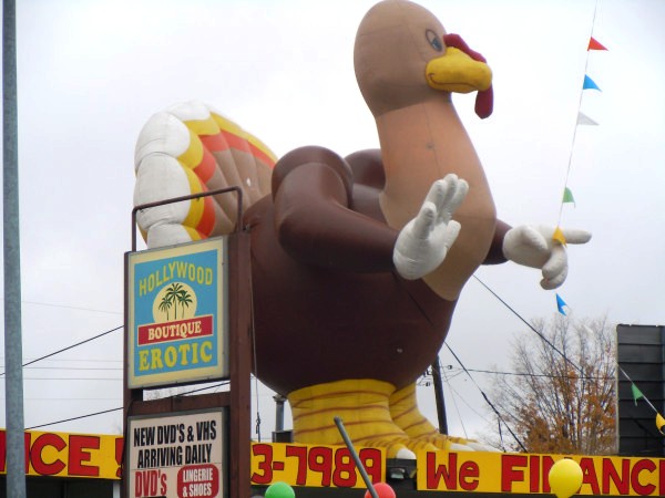 Super Sub Cindy spotted this juxtaposition while out & about on Division in Spokane today. Sez she: “Really. Nothing says Happy Thanksgiving like a giant inflatable turkey next to Hollywood Erotic Boutique.” Feel free to suggest cutlines.