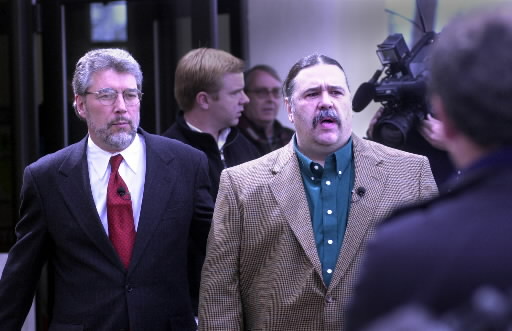 In this 2001 AP file photo, an emotional Donald Manuel Paradis is led by his lawyer Bill Mauk, left, out of the Kootenai County courthouse where a judge accepted a guilty plea to a lesser charge and set Paradis free. Paradis, once condemned to die for the 1980 murder of Kimberly Palmer, said he was best friends with Paul Ezra Rhoades and lamented Rhoades’ execution today. Story here. (SR photo: Jesse Tinsley)